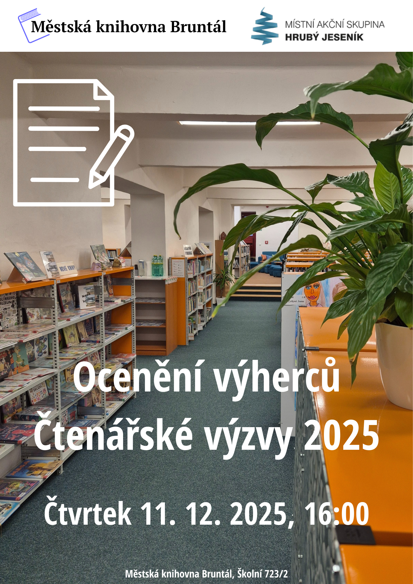srdečně vás zveme na slavnostní vyhlášení, které se v knihovně uskuteční ve čtvrtek 11. prosince 2025 od 16:00, a to v zadní místnosti oddělení pro děti a mládež.